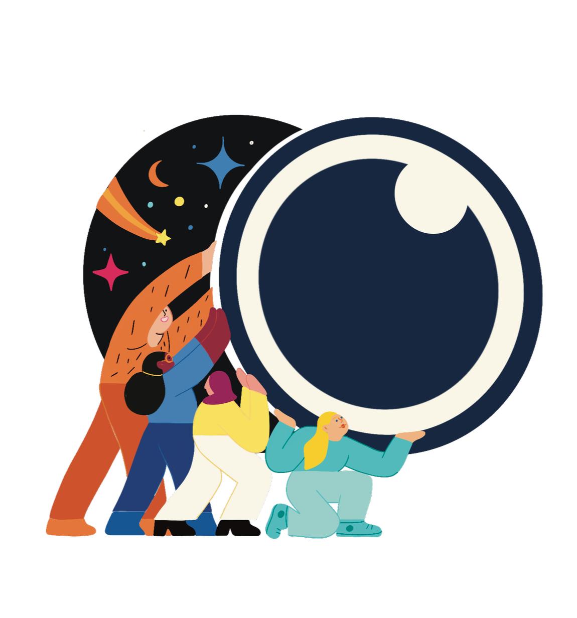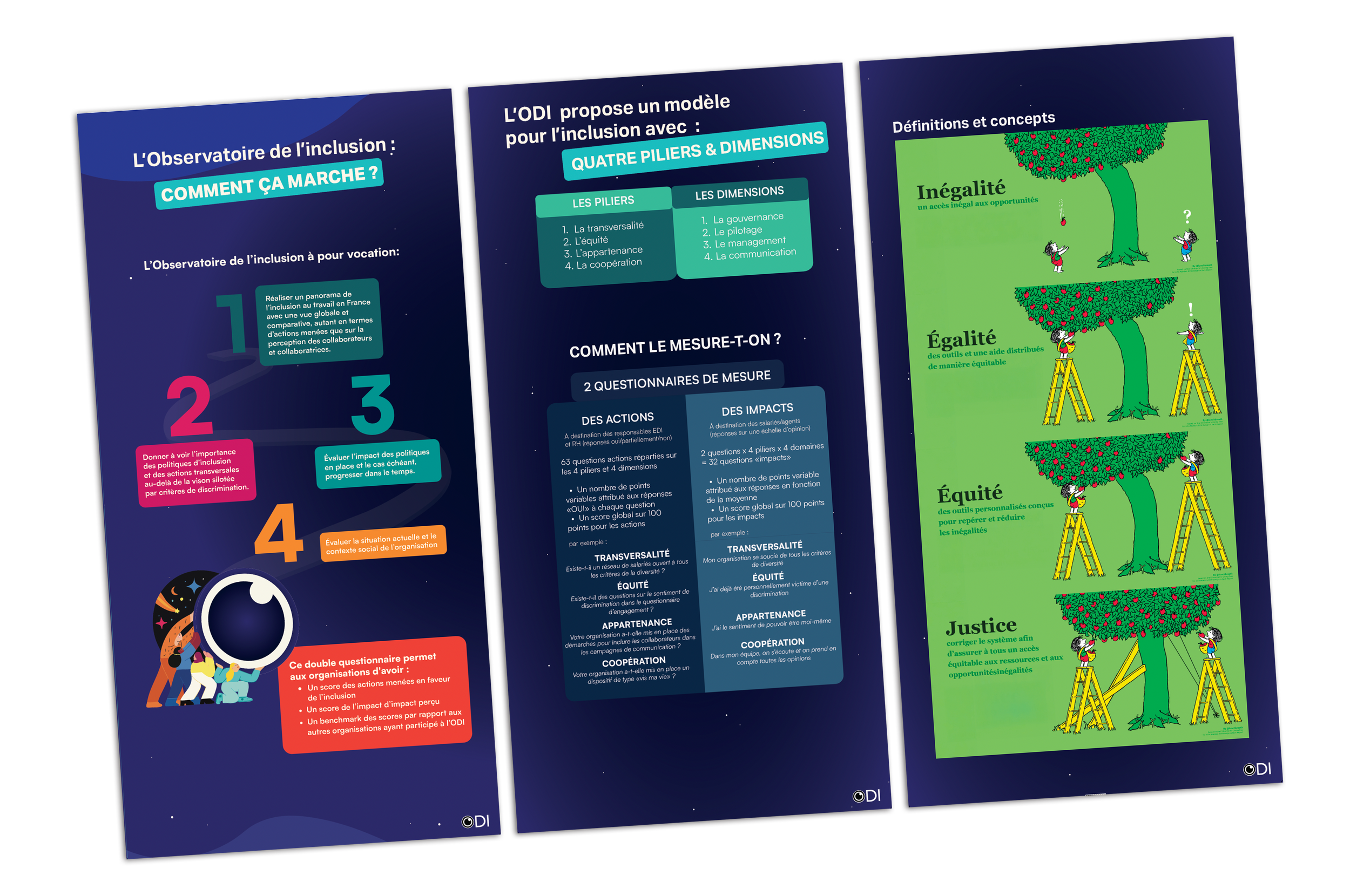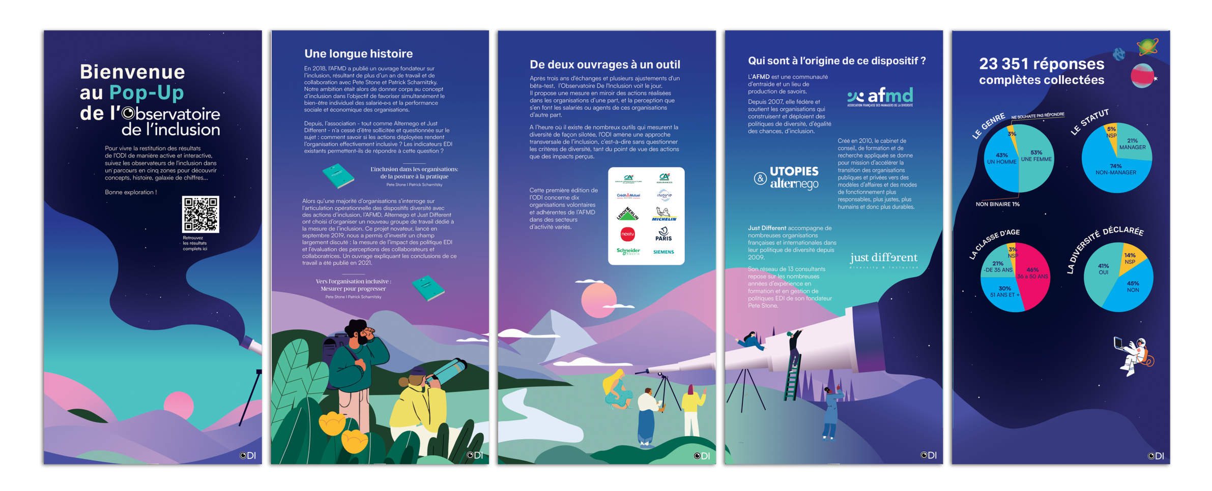 Pour le projet « L’Observatoire de l’Inclusion », développé par l’AFMD et un centre de recherche, j’ai assuré la direction artistique en créant un concept visuel et narratif destiné à rendre accessibles et engageants les résultats des questionnaires menés auprès des RH et des salariés. Ma proposition créative prend la forme d’une grande fresque qui se déploie kakémono après kakémono : on y suit un premier personnage qui, jumelles en main, initie l’observation, puis des figures équipées d’un télescope qui affinent le regard, jusqu’à un ciel nocturne où chaque étoile représente une entreprise participante. Cette métaphore visuelle, déclinée dans une charte graphique complète, permet de raconter de manière cohérente et immersive la construction collective de la cartographie de l’inclusion au travail.
