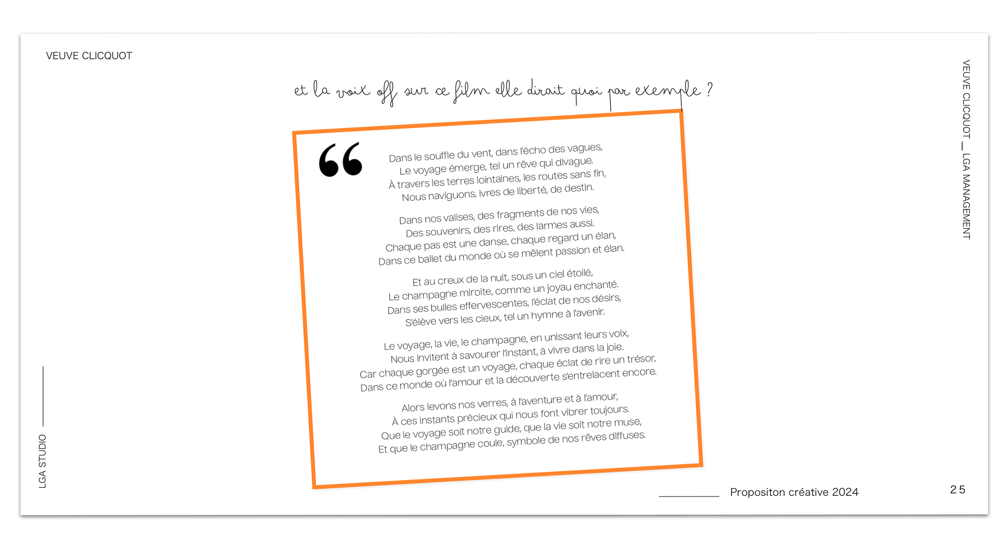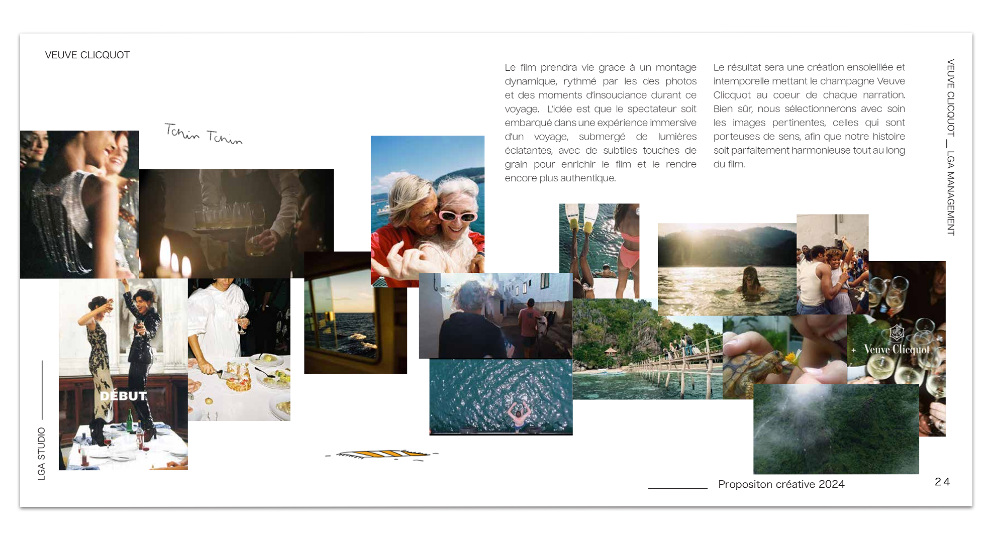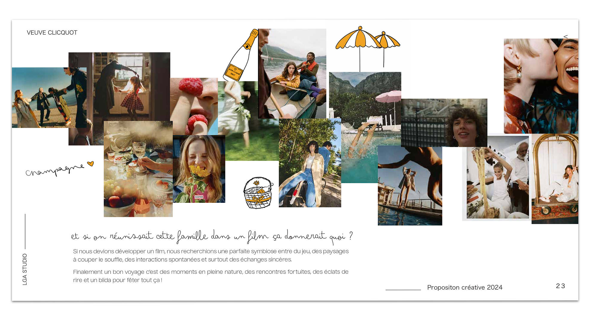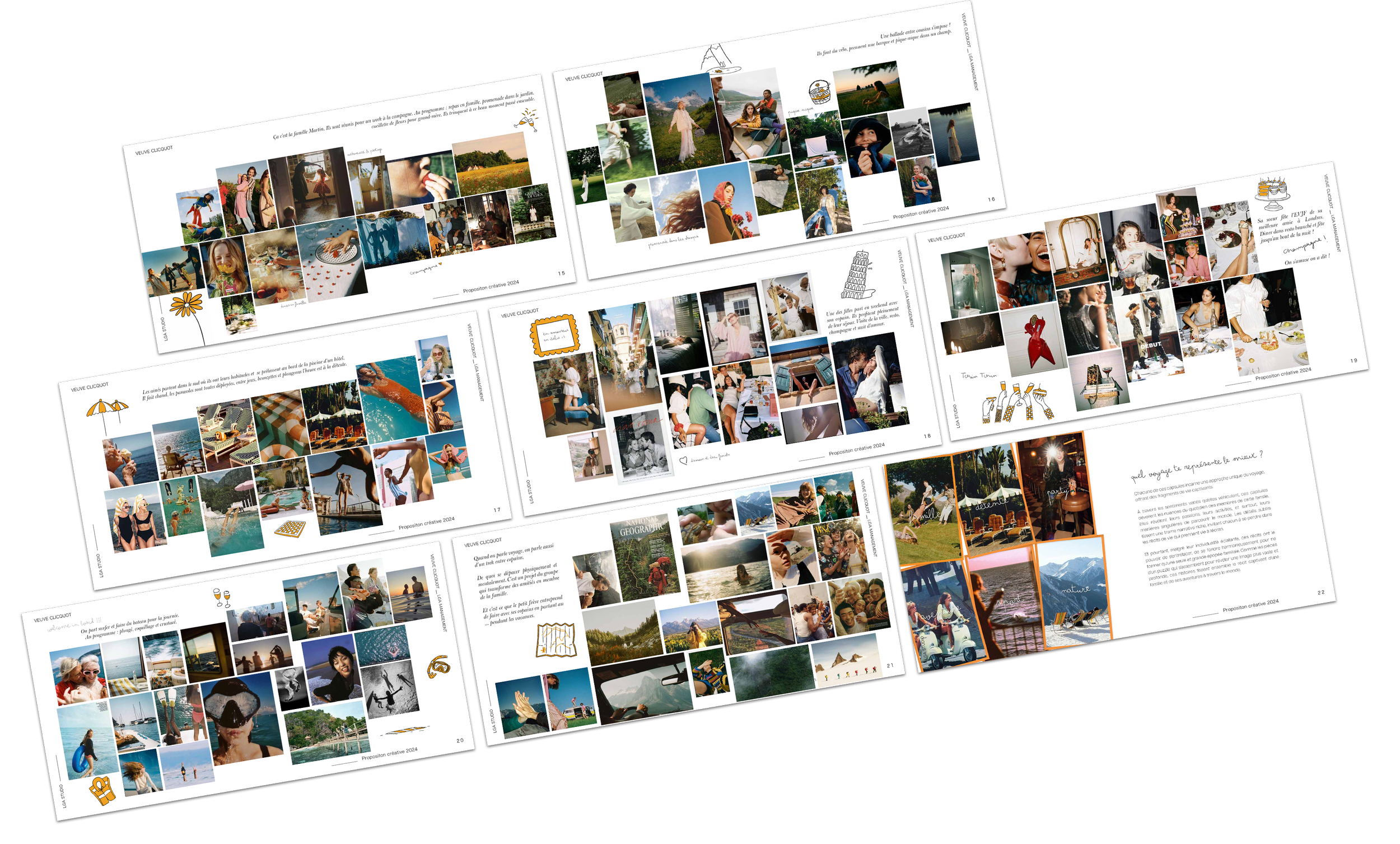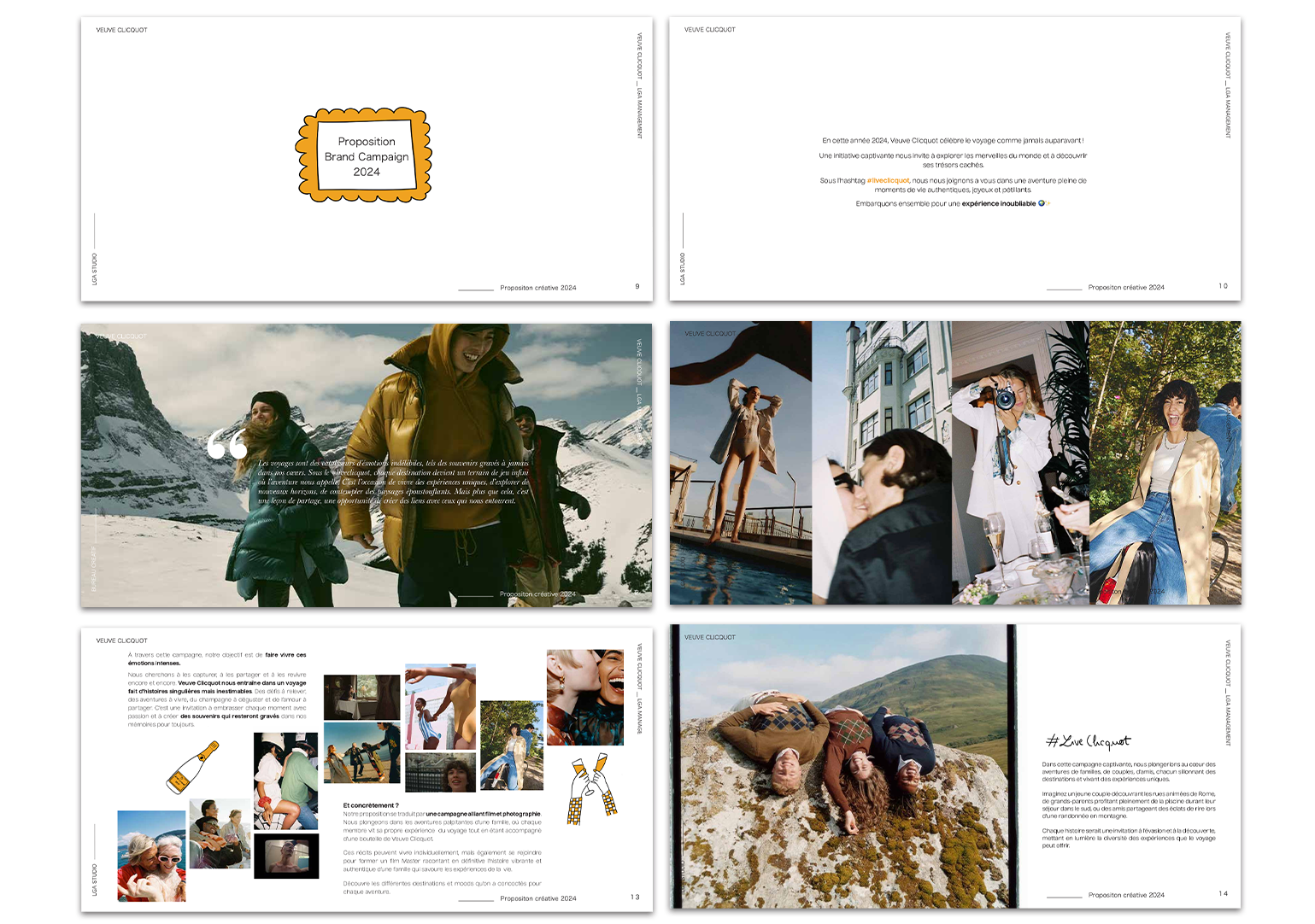 J'ai eu l’occasion de travailler sur une proposition créative pour Veuve Clicquot, dont l’objectif était de mettre la famille au cœur de la campagne, en valorisant l’authenticité des moments de vie partagés. La campagne se concentrait sur des expériences uniques : des voyages, des dîners, des aventures en famille, et les instants précieux vécus avec ses proches.